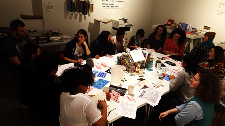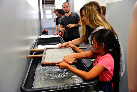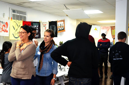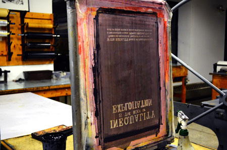 Combat Paper NJ and MPP presented a one-day screen printing and paper-making workshop exploring areas of overlap between the two groups' concerns, including the experiences of an undocumented person serving in the armed forces and military recruitment in high schools. The workshop started with a conversation around the question, "How do we create space for uncomfortable conversations?" Working in groups, workshop participants created graphic images in response to this question. At the conclusion of the workshop the graphics were printed onto freshly pressed Combat Paper.