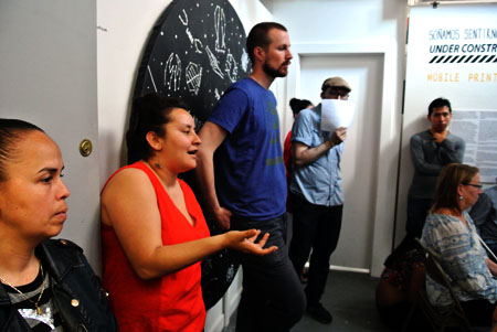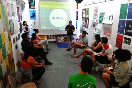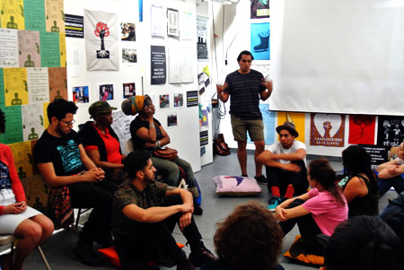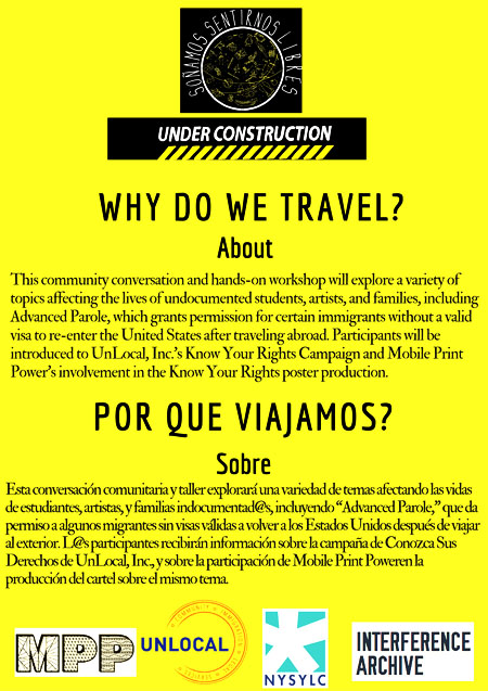 This community conversation and hands-on workshop explored a variety of topics affecting the lives of undocumented students, artists, and families, including Advanced Parole, which grants permission for certain immigrants without a valid visa to re-enter the United States after traveling abroad. Participants were introduced to UnLocal's Know Your Rights Campaign and MPP's involvement in the Know Your Rights poster production. We also recapped the collaborative workshop that Interference Archive, MPP, and NYSYLC led at IYECon 2016, Drawing From the Archives: Liberation & Collaborative Design, and we printed images created during the IYECon workshop based on the conference theme, "Rooted in Liberation."