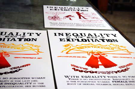 This three-hour workshop took place with women from the group Survivor Speak. Our goals for the workshop were to learn about the work of Survivor Speak and provide space for connections and conversation. With Survivor Speak, we worked to develop posters to raise awareness around the issues of female inequality, sexual violence, and sexual exploitation. This workshop followed the MPP process from start to finish: beginning with a conversation, question, collaborative image creation, and printing of posters.